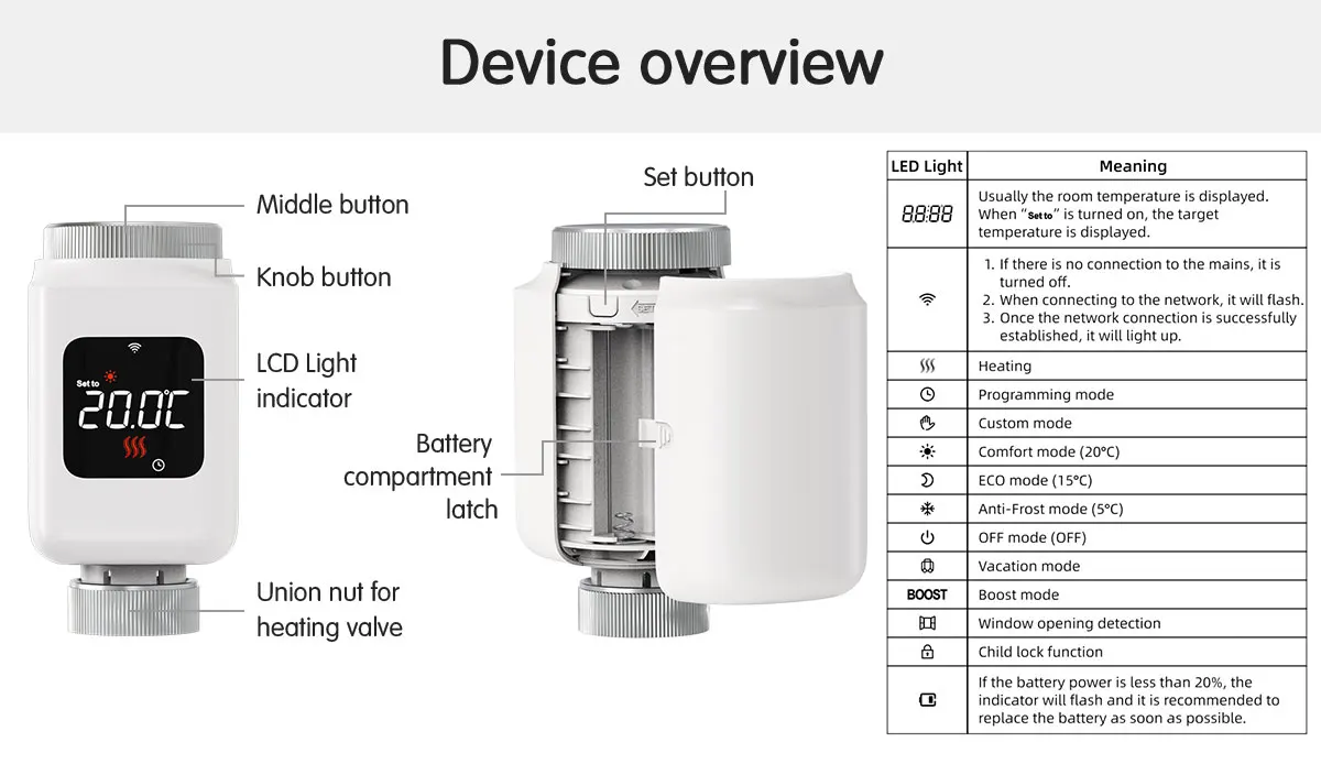 Comfort mode 20℃, ECO mode 15℃, Anti-freeze mode 5℃, OFF mode (valve completely closed)