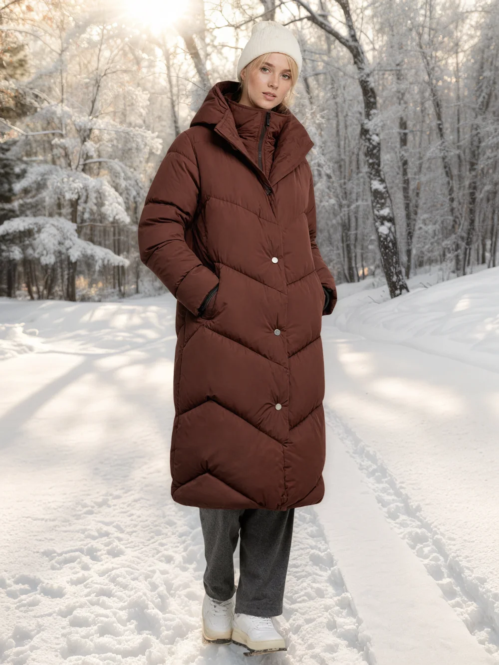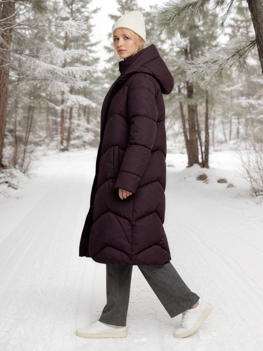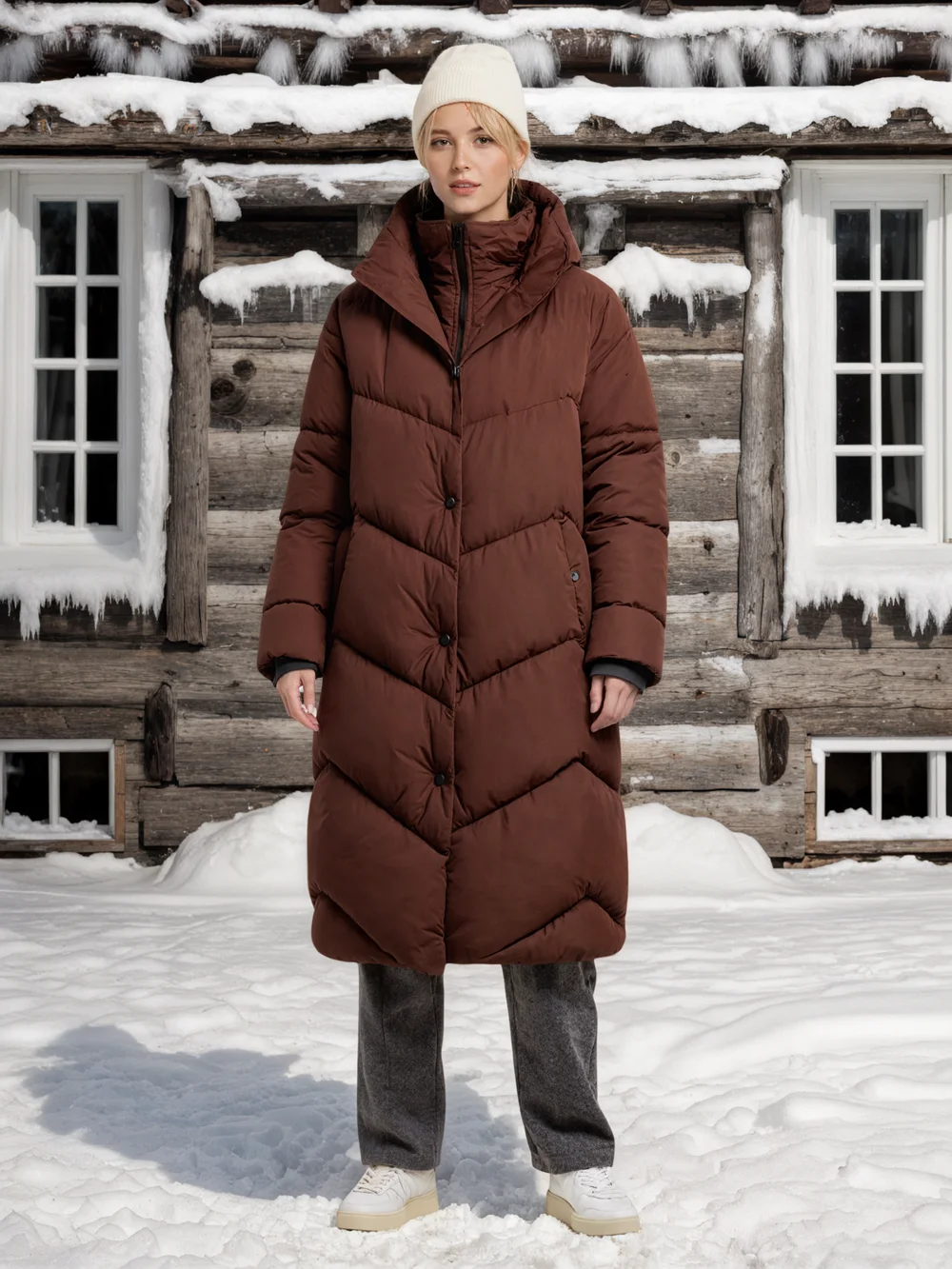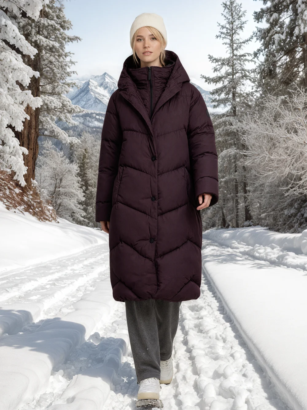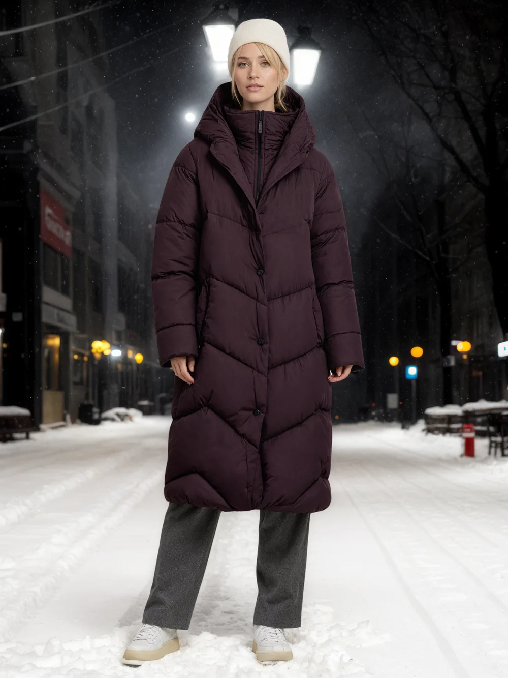 sustainable winter coat women, eco-friendly long jacket, recycled fabric outerwear, rain-resistant coat, warm winter parka, double layer winter jacket, ethical women’s fashion, winter sustainable clothing