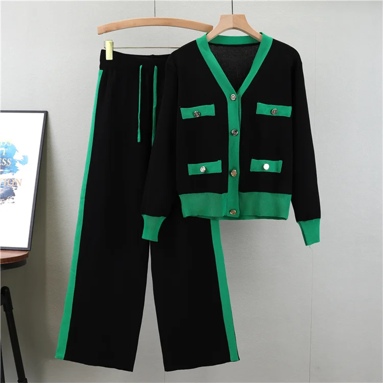 women’s knitted sweater set, v-neck cardigan outfit, 2-piece winter set, wide-leg pants suit, autumn knitwear for women, cozy sweater outfit, winter loungewear set, elegant knit two-piece